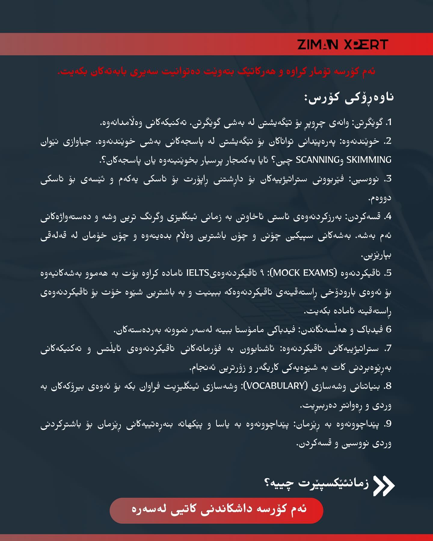 7. ستراتیژییەکانی تاقیکردنەوە: ئاشنابوون بە فۆرماتەکانی تاقیکردنەوەی ئایڵتس و تەکنیکەکانی بەڕێوەبردنی کات بە شێوەیەکی کاریگەر و زۆرترین ئەنجام.