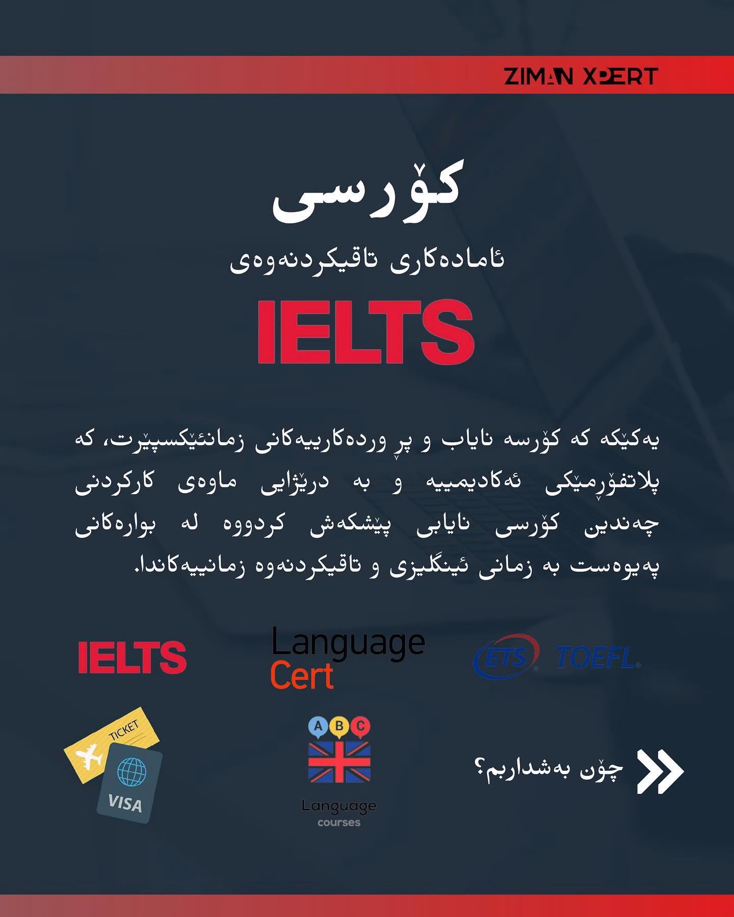 بەکەمترین کات و بەرزترین کوالێتی ، ئێستە ئەتوانیت لە ماڵەوە خۆت ئامادە بکەیت بۆ سەرکەووتن لە تاقیکردنەوەی ئایڵتس. لەگەڵ کۆرسی ئایڵتسی زمانئێکسپێرت، باندی سەروو ٦ بەدەست بێنە.